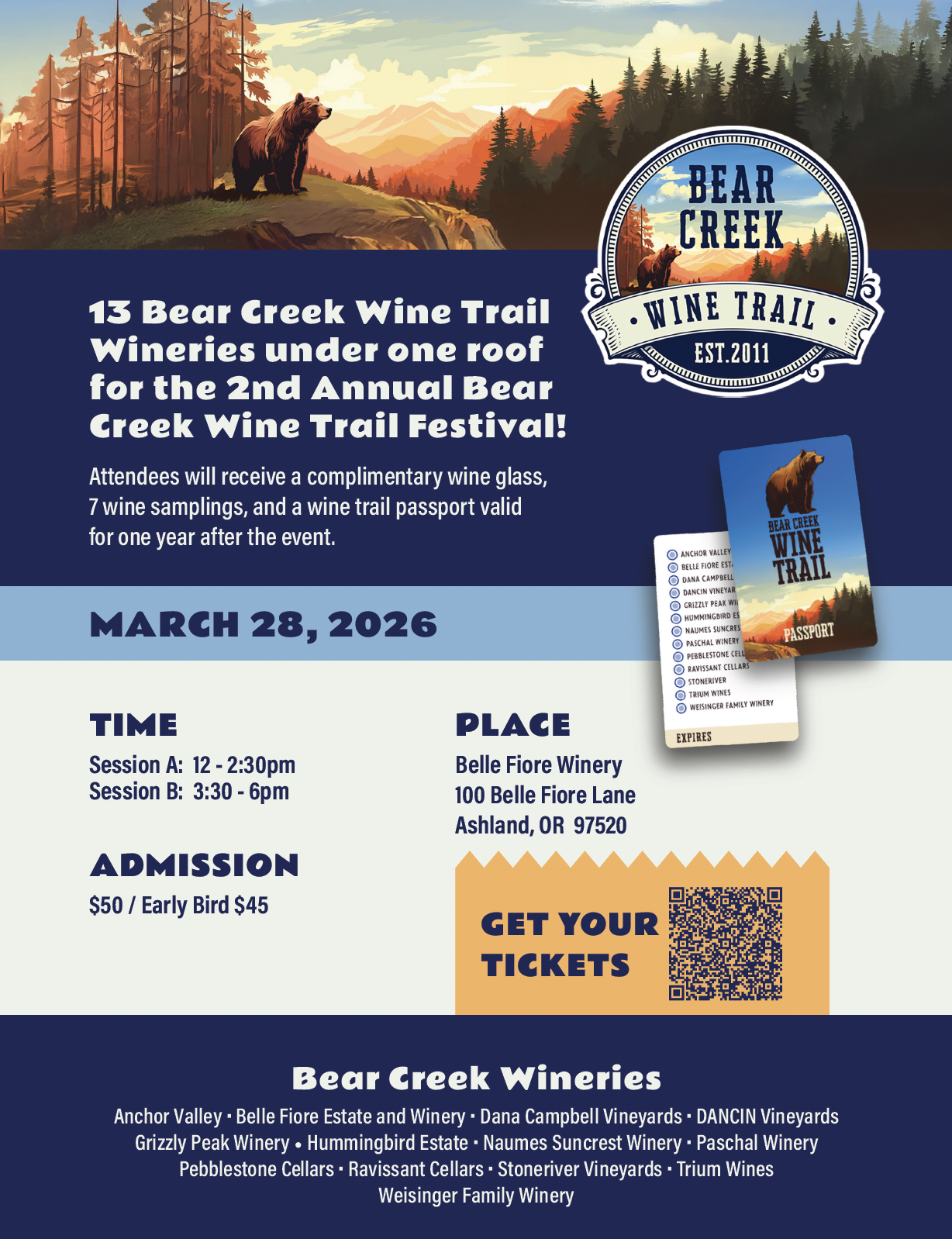 Join us March 28th for the 2nd annual Bear Creek Wine Trail Festival at Belle Fiore Estate Winery. Get ready to sip on delicious wines, soak up the beautiful vineyard...